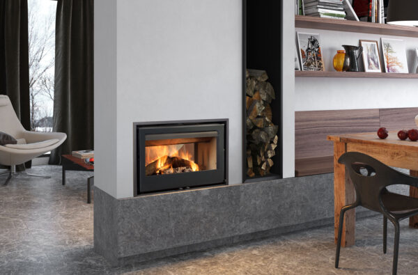 Véritable insert double faces avec porte battante, le compromis idéal pour être incorporer dans une cheminée traversante, ou bien pour séparer 2 pièces. Cet insert se compose de 2 portes réversibles, habillage intérieur en vermiculite, Possibilité d’arrivée d’air extérieur, Air primaire et secondaire préchauffés, Double déflecteur pour ajuster le tirage.